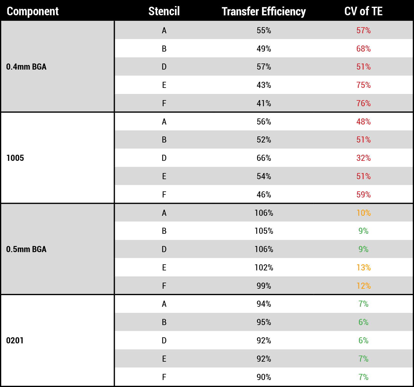 Table 1 shows TE and CV results for the remaining five stencils. The 0.5mm BGA (05BGA) exhibited an interesting range of CVs in or near the 10-15% range. Therefore, the solder paste volume and release data for the 05BGAs are the focus of the analysis.